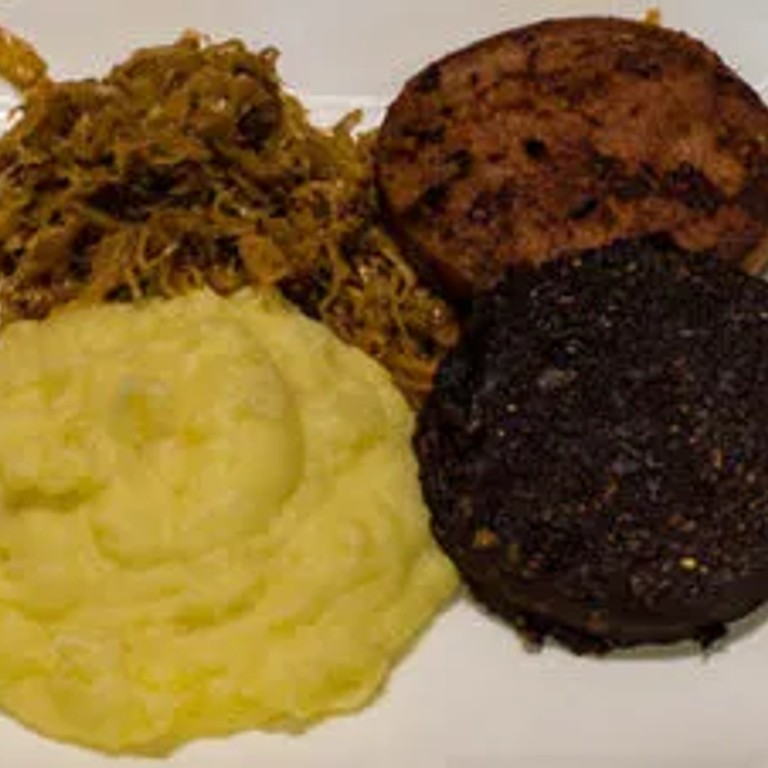 Wurstebrot mit Leberbrot, glasierte Apfelspalten, Kartoffelpüree und Röstizwiebeln