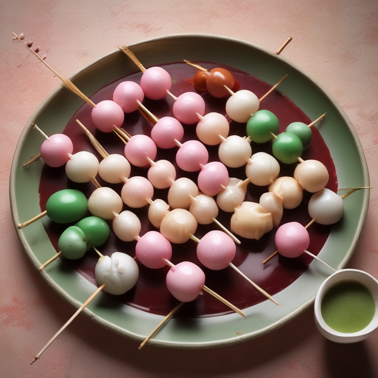 Dango is a traditional Japanese sweet made from glutinous rice flour, shaped into small balls and often served on skewers. This recipe features a delightful combination of flavors and colors, making it a perfect treat for festivals or a sweet snack at home.