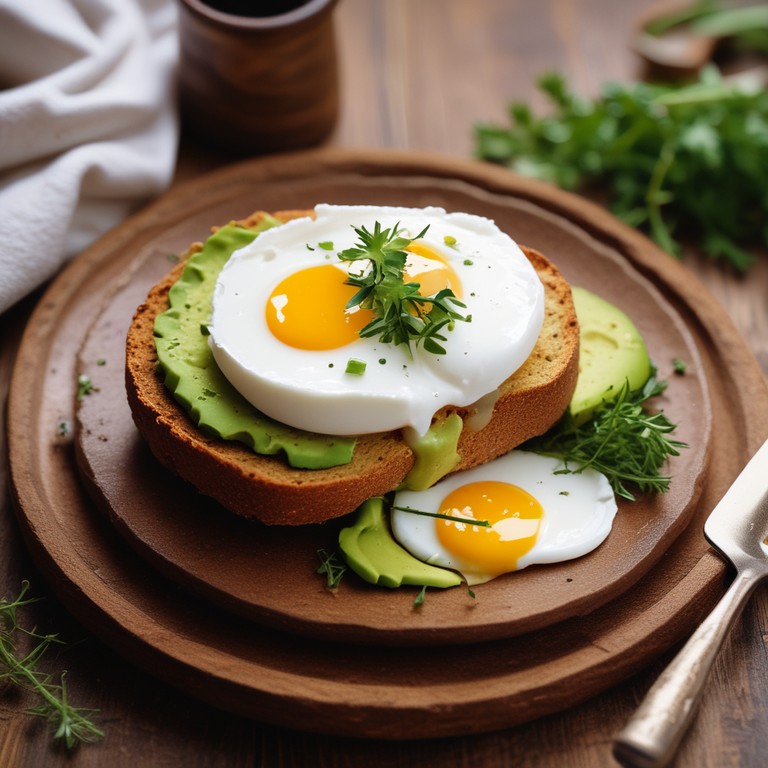 This recipe features perfectly poached eggs served on a bed of creamy avocado spread over toasted whole grain bread. It's a nutritious and delicious breakfast or brunch option that is both satisfying and visually appealing.