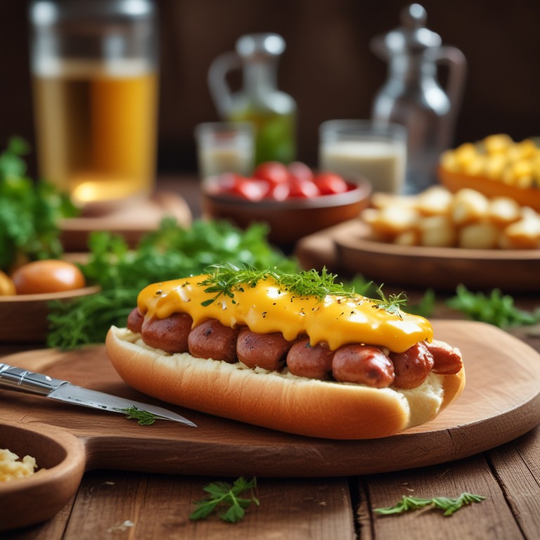 Un delicioso y sustancioso platillo que combina salchichas, huevos revueltos y papas doradas, todo dentro de un pan crujiente y cubierto con queso derretido.