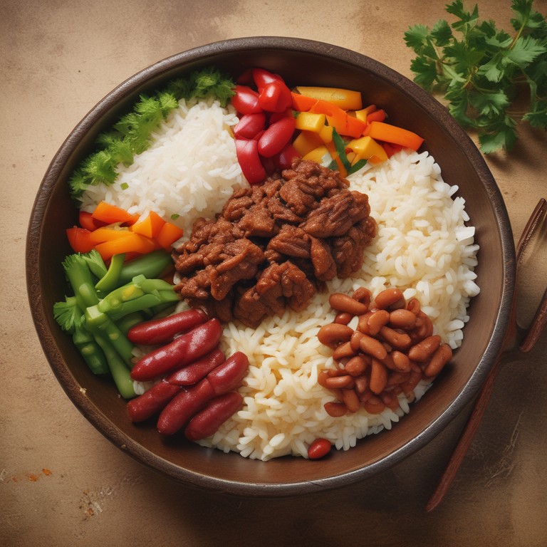 Un plato sustancioso y lleno de sabor que combina arroz, frijoles enlatados y carne roja, ideal para una comida reconfortante.