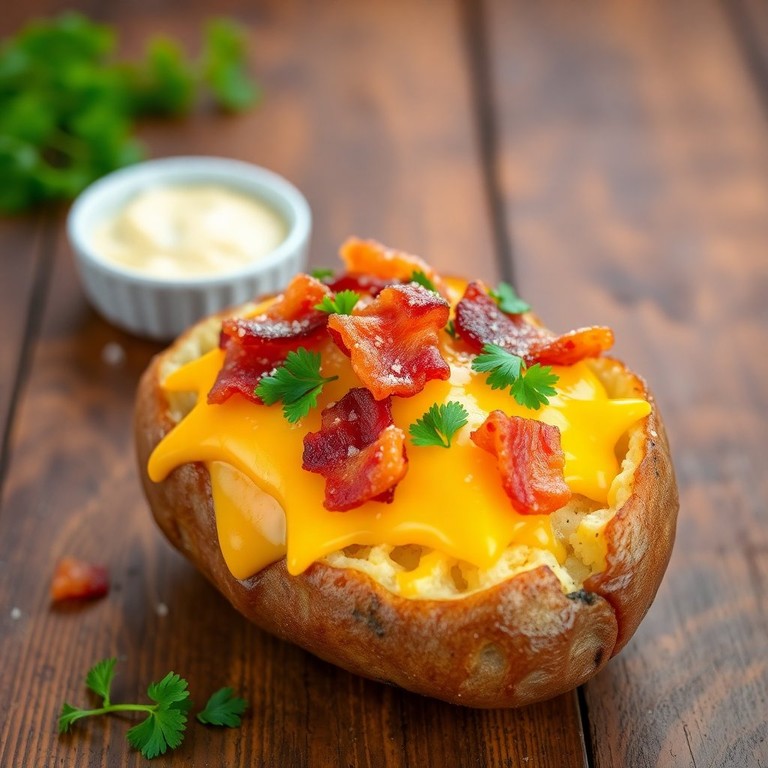 Uma deliciosa receita de batata assada recheada com queijo cheddar cremoso e bacon crocante, perfeita para acompanhar qualquer refeição ou como um lanche saboroso.