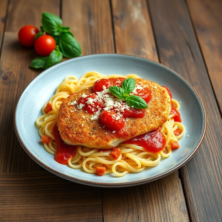 Pechuga de Pollo a la Parmesana con Pasta Corta y Salsa de Tomate Fresco