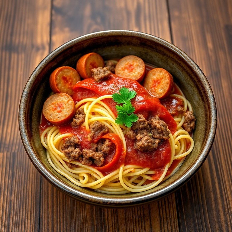 Uma versão sofisticada do miojo, com carne de hambúrguer e um molho de tomate caseiro, perfeita para uma refeição rápida e saborosa.