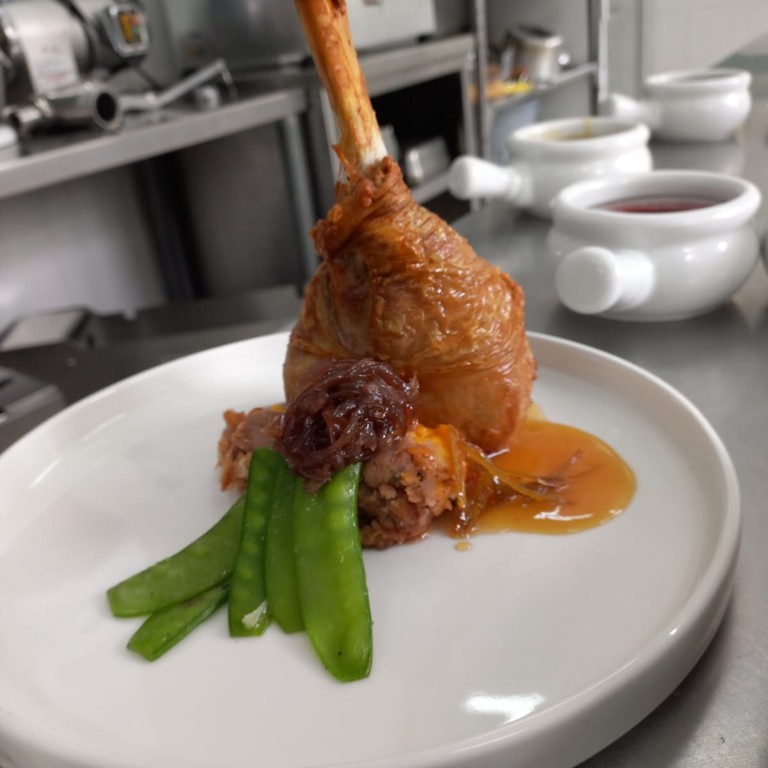 Una jugosa pierna de pavo, acompañada de una vibrante salsa de arándano y naranja que realza su sabor.