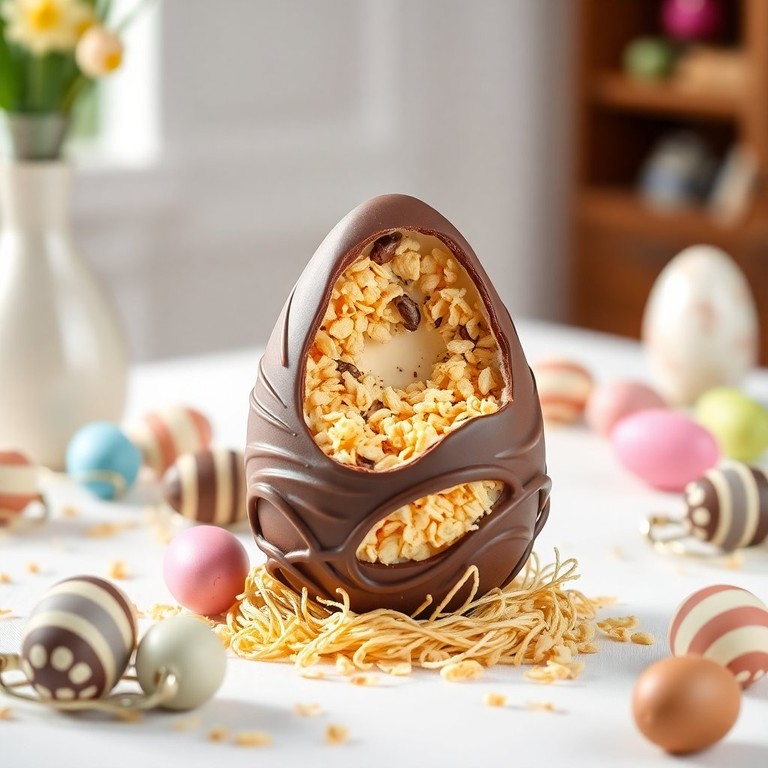 Uma mistura perfeita de chocolate e crocância que vai deixar sua Páscoa inesquecível! Este ovo de Páscoa é recheado com um creme de Nescau e arroz tufado, proporcionando uma experiência deliciosa e crocante.