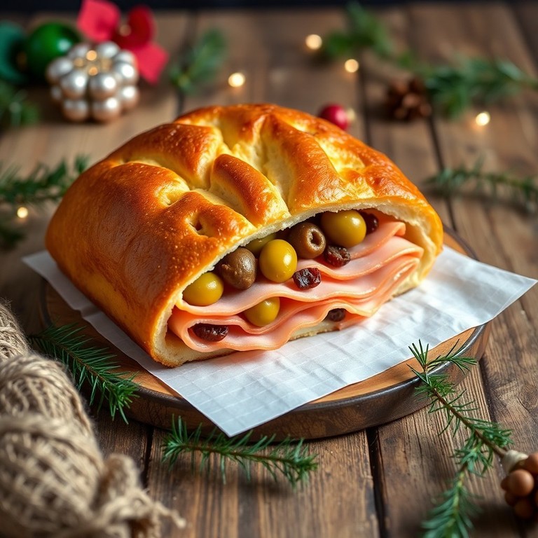 Un delicioso pan relleno de jamón, aceitunas y pasas, ideal para cualquier celebración.