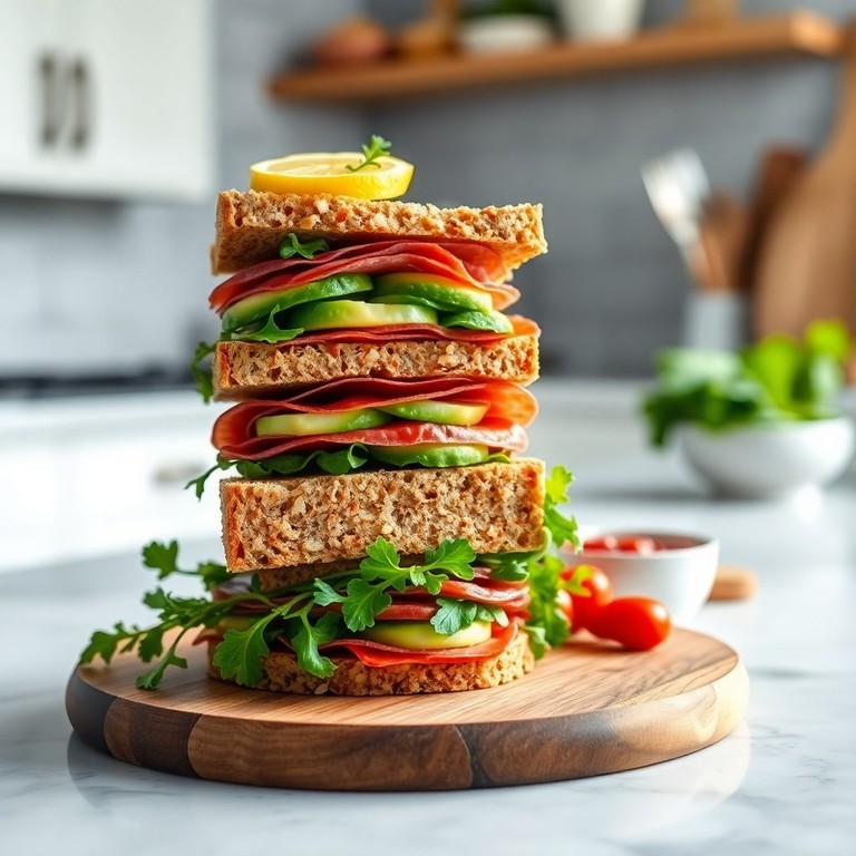 Ein leichter, aber dennoch köstlicher Turm aus Vollkornbrot, der unter 500 kcal bleibt. Perfekt für einen gesunden Lunch oder Snack, ohne auf Geschmack zu verzichten. Die Kombination aus würziger Salami, cremiger Avocado und frischem Rucola sorgt für ein ausgewogenes Geschmackserlebnis.