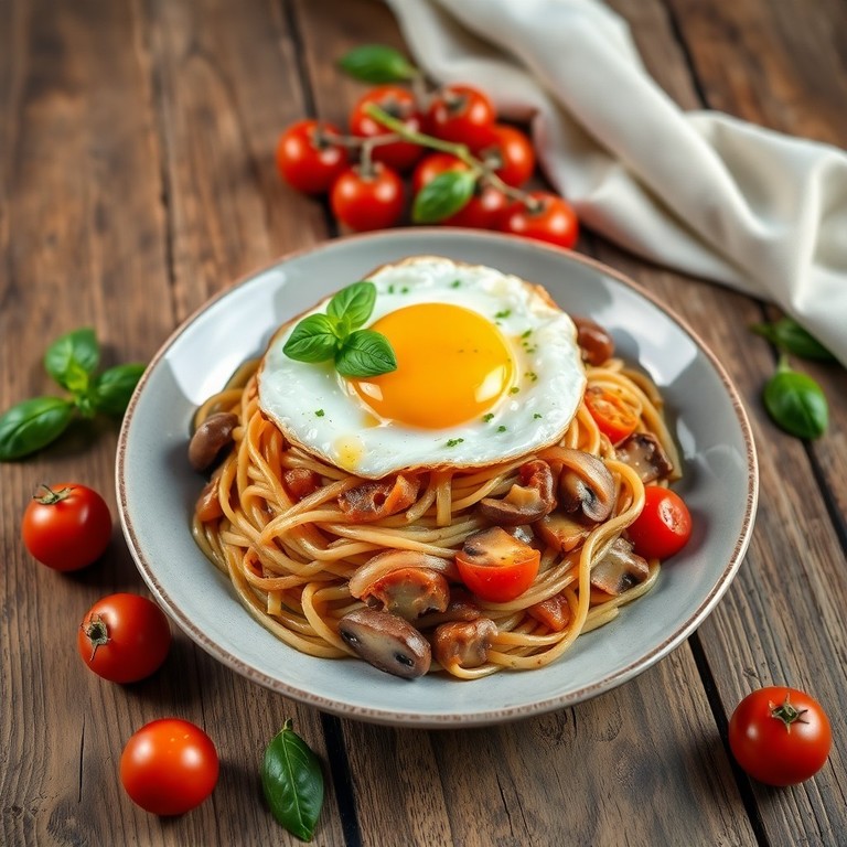 Fideos Salteados con Champiñones, Huevo Frito y Toque de Albahaca