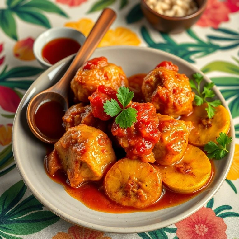 Un plato agridulce caribeño que combina pollo tierno con plátanos maduros caramelizados y una salsa de tomate y cebolla fragante. Perfecto para una cena exótica y reconfortante.
