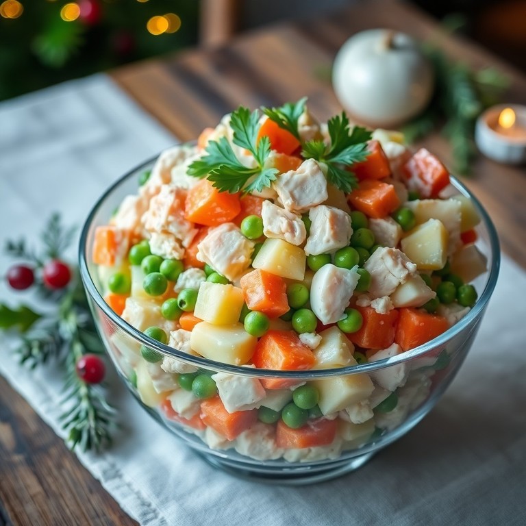 Традиционный салат Оливье с вареной курицей, картофелем, морковью, маринованными огурцами и зеленым горошком, заправленный нежным майонезным соусом с горчицей. Идеальное блюдо для праздничного стола, которое легко приготовить и которое порадует гостей своим классическим вкусом.