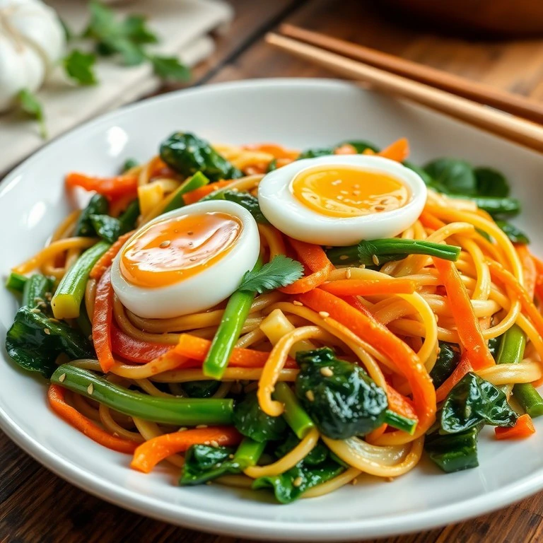 Un plato rápido y colorido que mezcla fideos con zapallitos, chauchas, zanahorias y espinaca, coronado con un huevo pochado para añadir proteínas y textura. Ideal para una cena ligera y nutritiva.