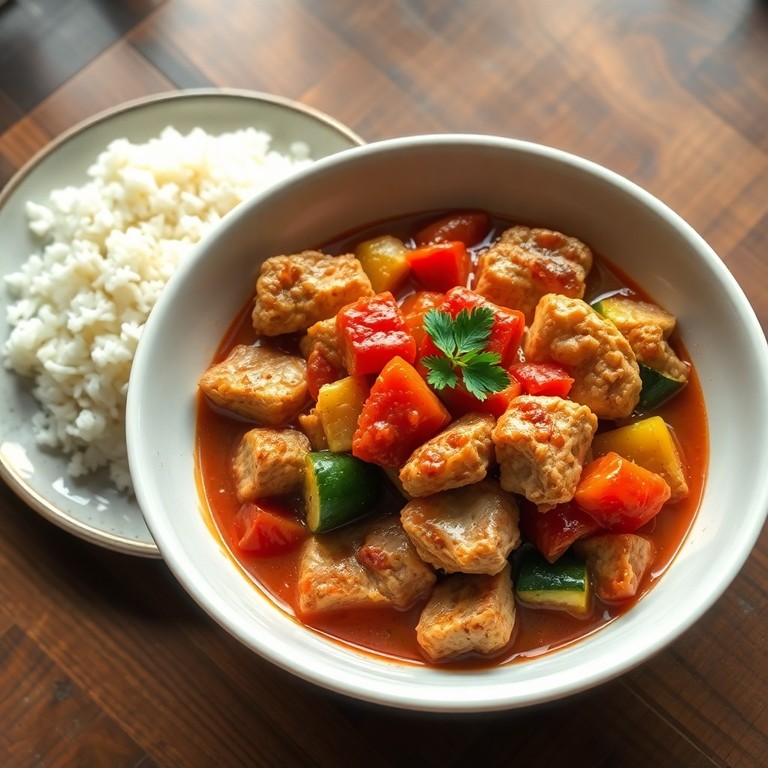Ein aromatischer mediterraner Eintopf mit saftigem Putenfleisch, Tomaten, Zucchini und Paprika, der langsam geschmort wird, um intensive Aromen zu entfalten. Serviert mit lockerem Reis ist dieses milchfreie Mittagsgericht gesund, sättigend und voller Geschmack.