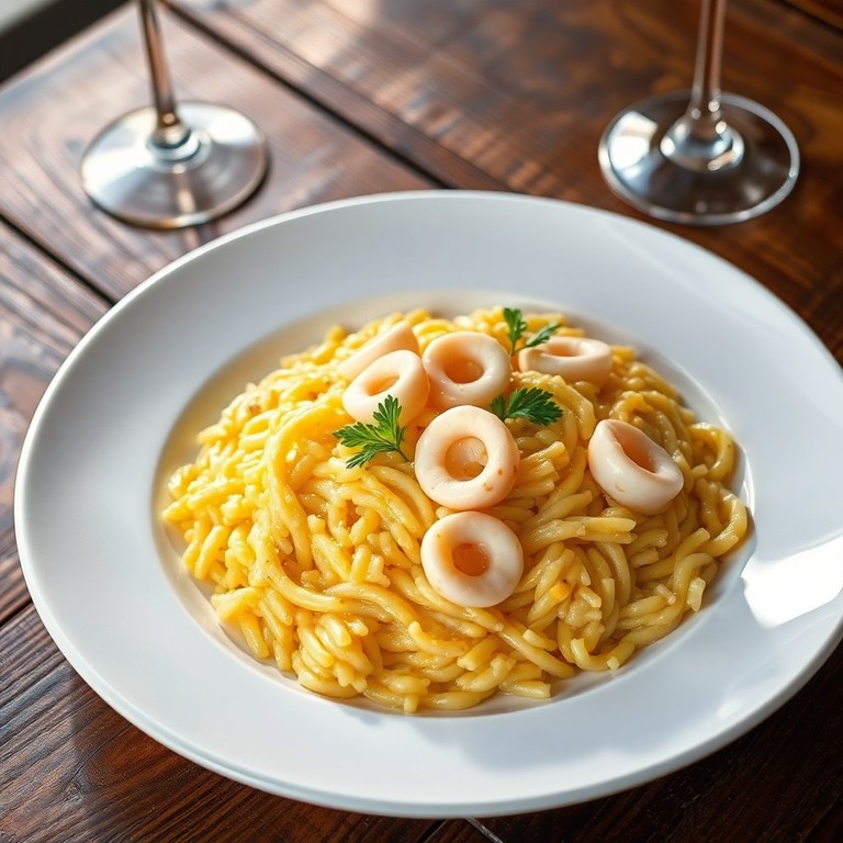 Un cremoso risotto arricchito con calamari teneri e un tocco di zafferano, perfetto per una cena elegante e raffinata. Questo piatto unisce la delicatezza del mare con l'aroma inconfondibile dello zafferano, offrendo un equilibrio di sapori e una consistenza vellutata che conquista al primo assaggio.