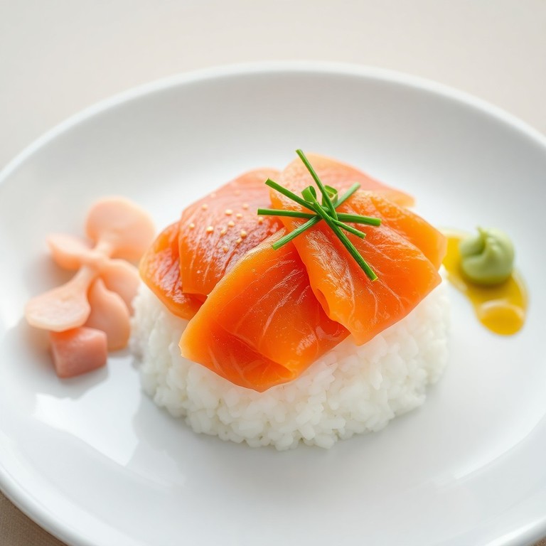 Un piatto classico giapponese che combina fettine sottili di salmone fresco sashimi con riso bianco aromatico cotto a vapore, accompagnato da condimenti tradizionali come salsa di soia, wasabi e zenzero marinato. Questo piatto leggero e raffinato esalta la freschezza del pesce e la delicatezza del riso, ideale per un pasto elegante e salutare.
