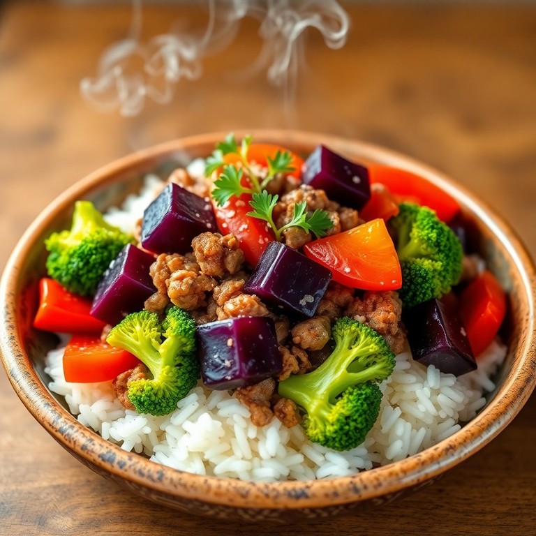 Salteado de Carne Molida con Vegetales al Vapor y Arroz