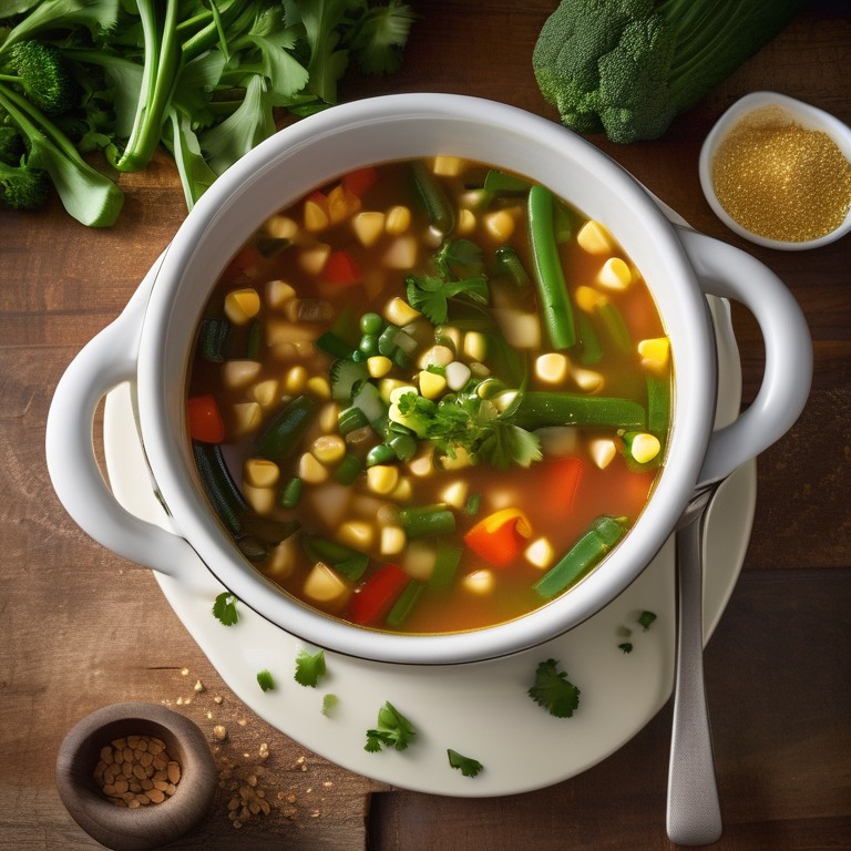 Eine herzhafte Gemüsesuppe voller gesunder Zutaten wie Brechbohnen, Mais, Paprika, Zucchini und Brokkoli.