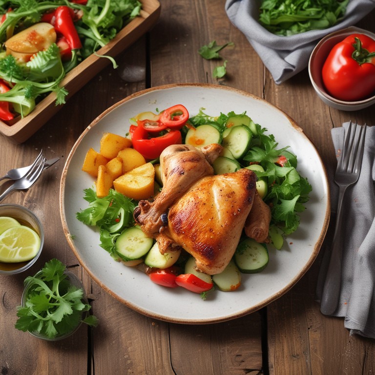 Un delicioso plato de muslo de pollo asado acompañado de papas doradas y una fresca ensalada de vegetales, ideal para una comida familiar.