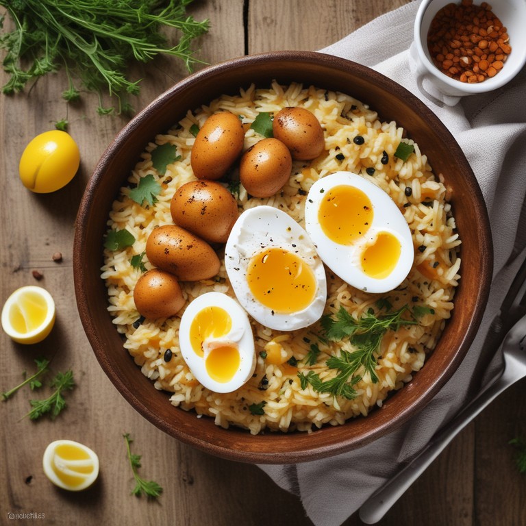 A hearty and flavorful rice bowl featuring spiced potatoes and eggs, perfect for a comforting meal.
