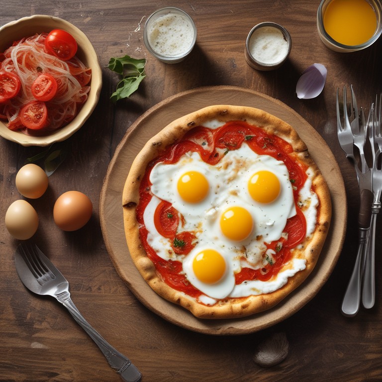 Uma deliciosa pizza com molho de tomate, queijo mussarela derretido, cebola e ovos, perfeita para um jantar em família.