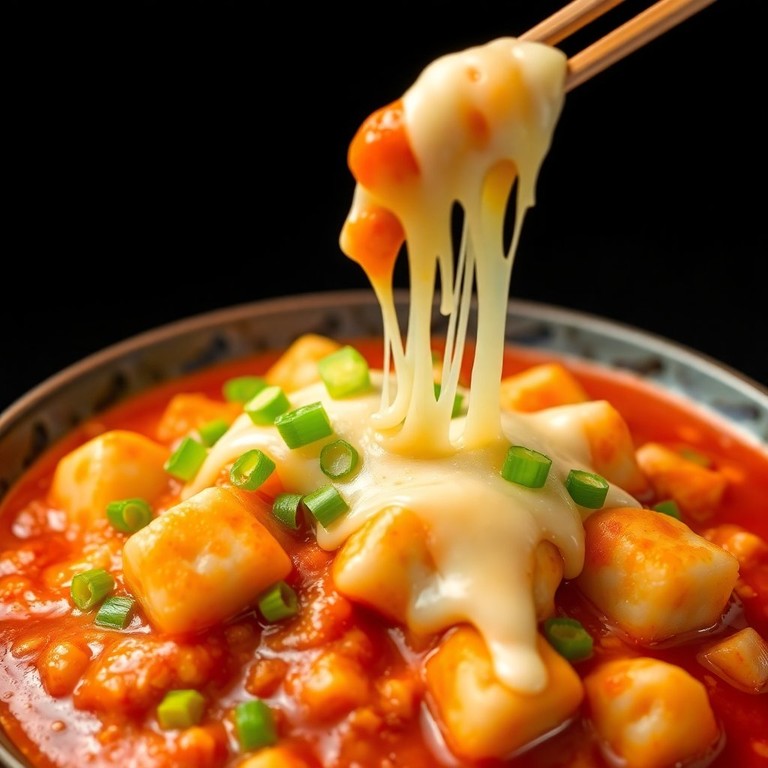 Una deliciosa fusión de la tradicional receta coreana de tteokbokki con un cremoso queso fundido, perfecta para los amantes del queso y los sabores picantes.