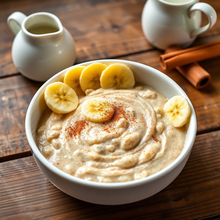 Disfruta de una deliciosa avena preparadada con canela, vainilla y trozos de plátano, servida fría o caliente, ideal para un desayuno reconfortante en solo 15 minutos.