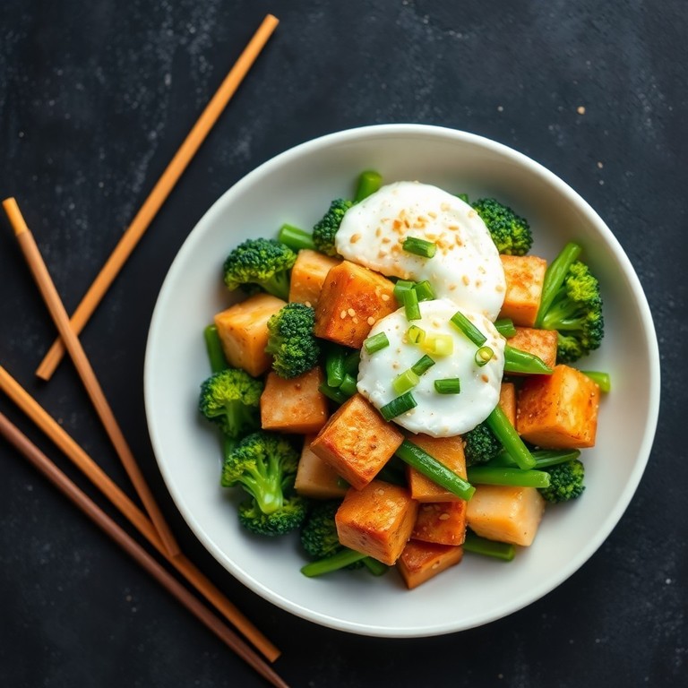 Ein schnelles und gesundes asiatisches Stir-Fry mit knusprigem Tofu, knackigem Brokkoli, grünen Bohnen und zarten Kartoffelwürfeln, verfeinert mit aromatischem Knoblauch, Ingwer und einem Hauch Sesamöl. Das Gericht wird durch fluffiges Rührei ergänzt und eignet sich perfekt als nahrhafte Mahlzeit für jeden Tag.