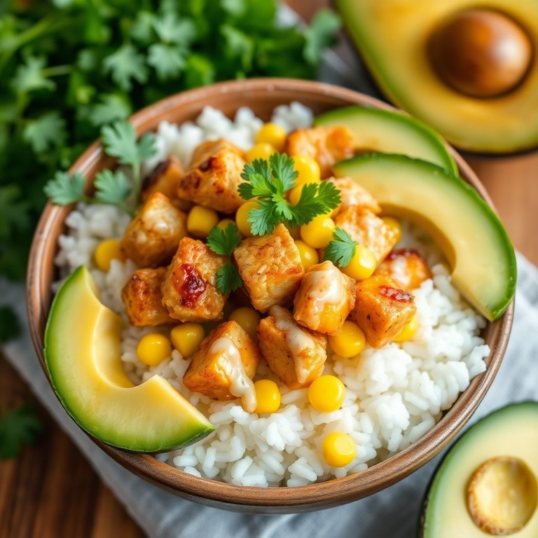 Un bowl nutritivo que combina arroz blanco esponjoso con pollo asado sazonado, maíz dulce y una cremosa salsa con toque de lima, decorado con cilantro fresco y opcionalmente acompañado de aguacate para un sabor tropical y equilibrado.