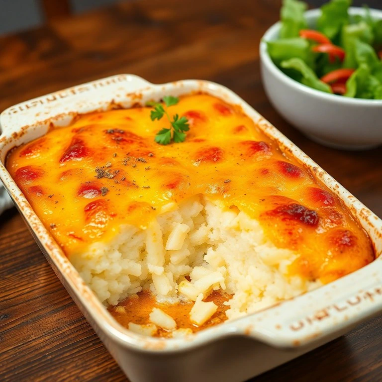 Un plato reconfortante y crujiente que combina capas de arroz, puré de papa y queso derretido, perfecto para una cena familiar o para llevar. Este pastel al horno ofrece texturas suaves y cremosas junto con una cubierta dorada y apetecible, ideal para disfrutar en cualquier ocasión.