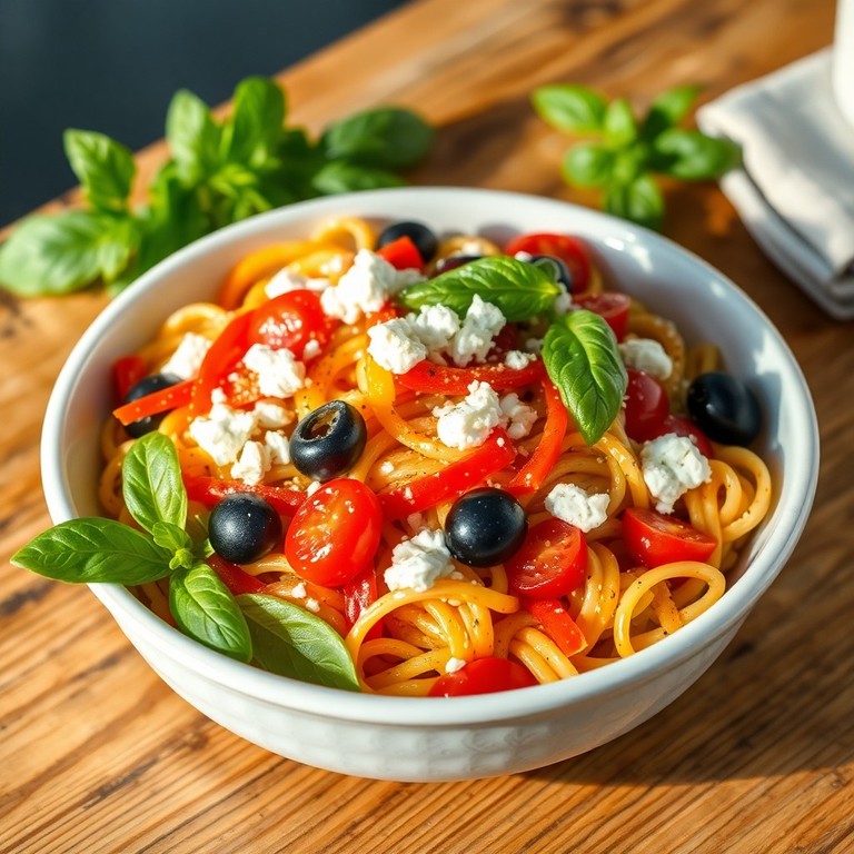 Ensalada de pasta mediterránea con verduras y queso feta