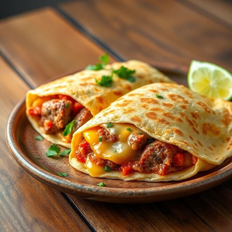 Una opción rápida que combina huevos en salsa de tomate casera, salchicha dorada y queso derretido, todo envuelto en una tortilla de harina crujiente para un desayuno satisfactorio y lleno de sabor.