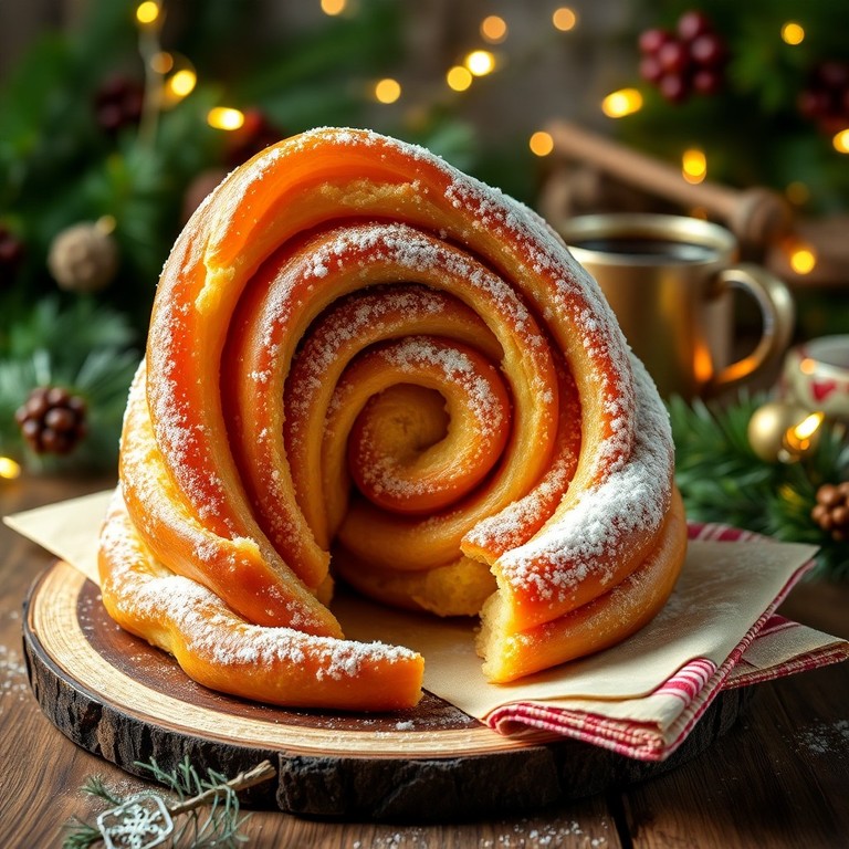 Dieser traditionelle ungarische Baumstriezel, auch als Kürtőskalács bekannt, wird wie auf dem Weihnachtsmarkt frisch gebacken. Der Hefeteig wird um eine Holzrolle gewickelt, goldbraun gebacken und anschließend großzügig mit Puderzucker bestäubt. Perfekt für festliche Anlässe und ein Highlight auf jeder winterlichen Kaffeetafel.