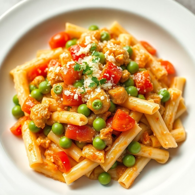 Um prato prático e saboroso para o jantar, combinando macarrão cozido com um molho cremoso feito com proteína de soja, ervilha, tomate e temperos, resultando em uma refeição nutritiva e reconfortante.