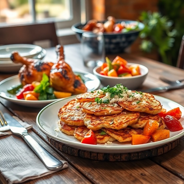 - Knapperige Aardappelpannenkoekjes met Kruiden, Parmezaanse Kaas, Knoflook, Geroosterde Kippenbout en Groenten