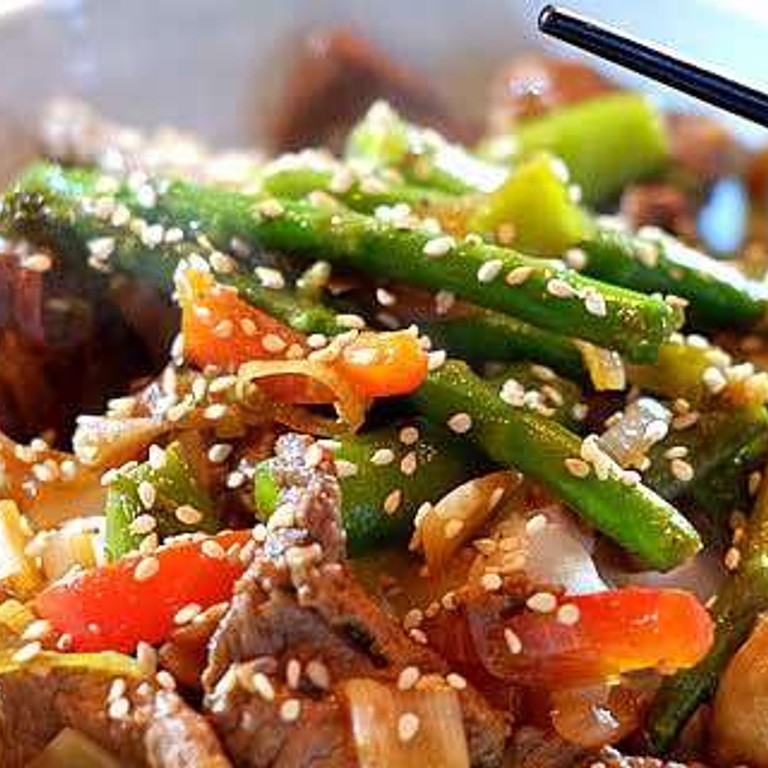 Beef teriyaki met roergebakken groene asperges, sugarsnaps en rijstnoedels