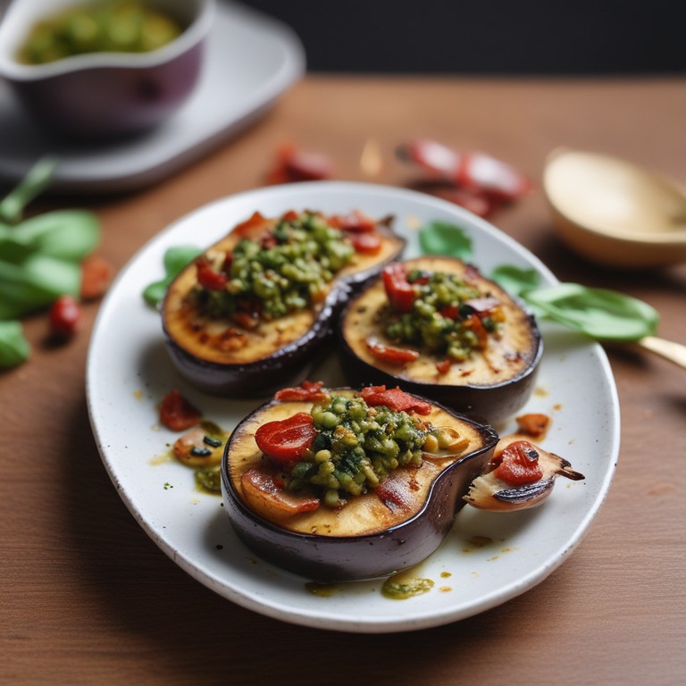 - Gegrilde Aubergine met Champignons, Pesto en Gekruide Spekjes