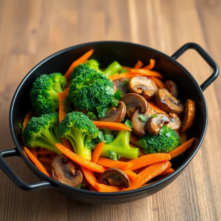 Wok met broccoli, wortel en champignons in knoflook-gingersaus