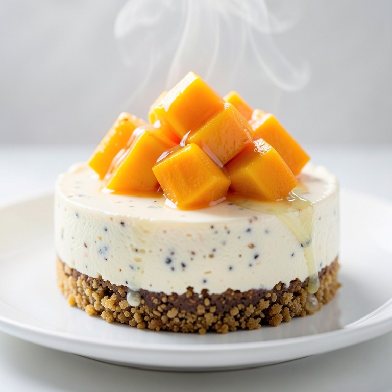 Cheesecake onctueux aux spéculoos, mangue fraîche et vanille