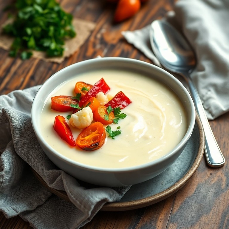 Romige bloemkoolsoep met kruidenbouillon en geroosterde groenten