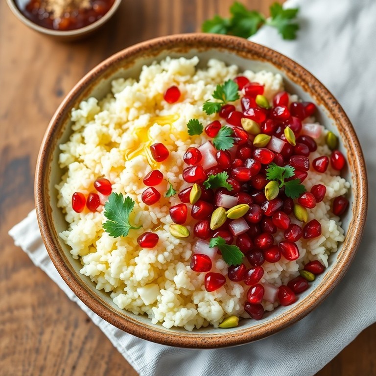 Gezonde bloemkoolrijst bowl met granaatappel en pistachenoten