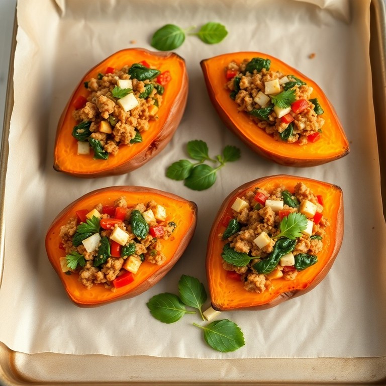 Gevulde zoete aardappel met kipgehakt en spinazie
