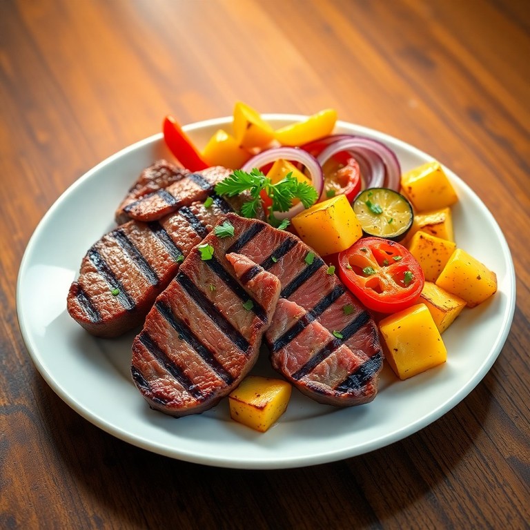 Grillgebakken vlees met geroosterde aardappels en gegrilde groenten