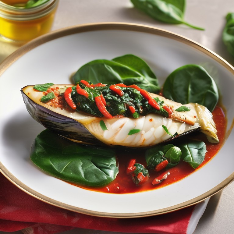 Fish and Spinach Stuffed Eggplant with Mint and Chili