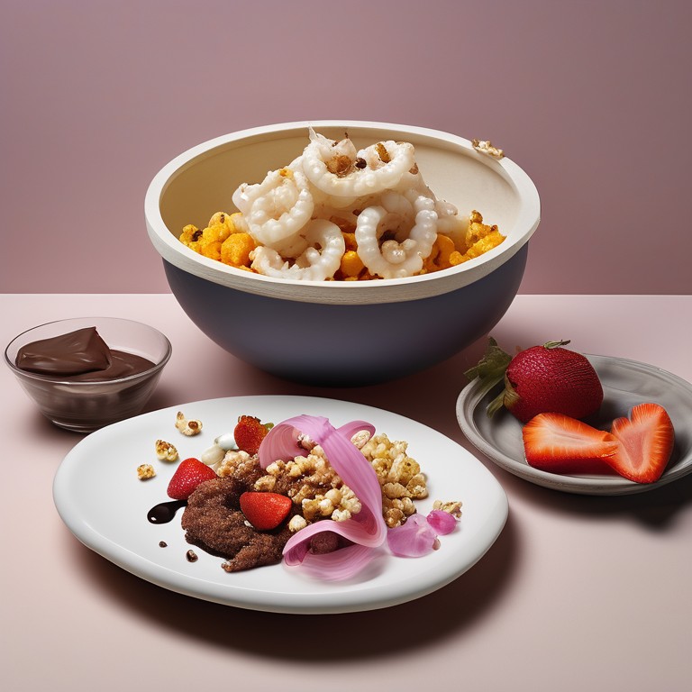 Calamari with Pickled Cabbage, Rose Petals, Popcorn, Chocolate, Beef Fat, Squash, Strawberries, and Dough