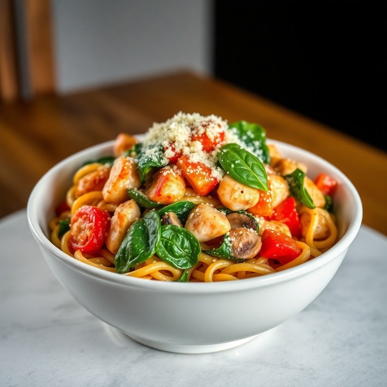 - Pesto Kip Pasta Primavera met Spinazie en Tomaat en Parmezaanse Kaas