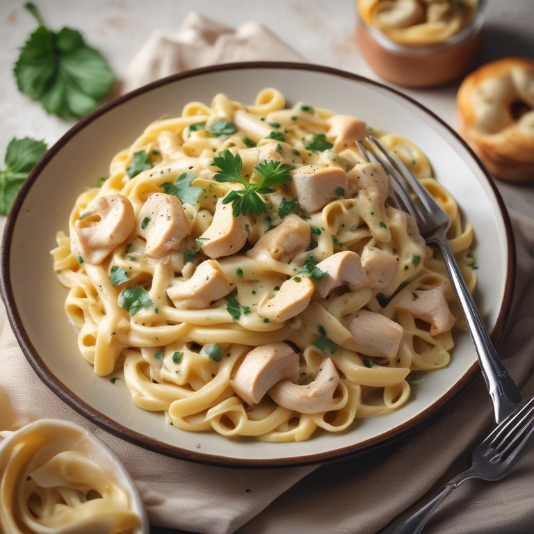 A delicious and creamy chicken pasta dish with a rich garlic flavor.
