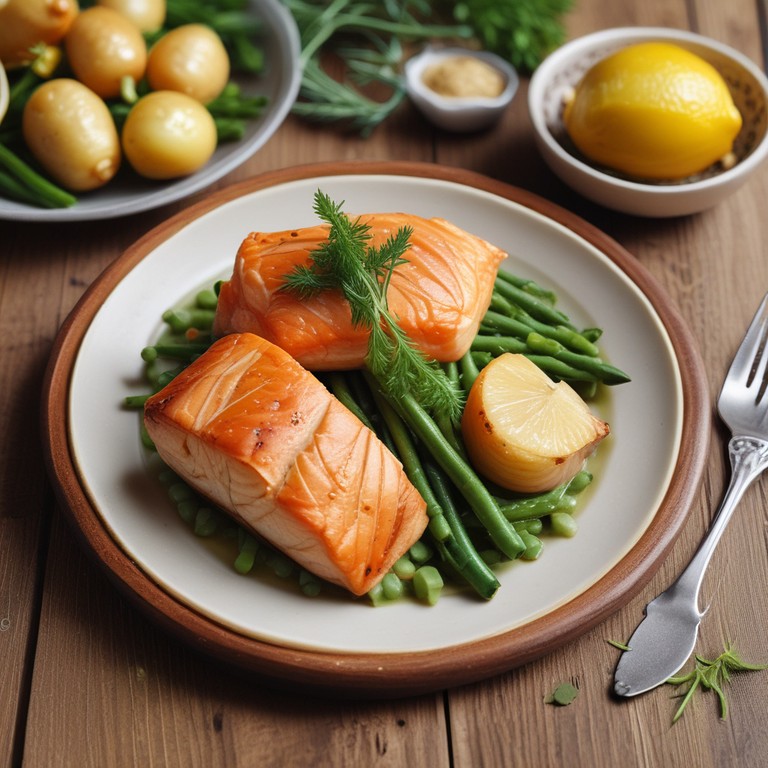 Een heerlijk gerecht van zalmfilets omhuld met knapperig bladerdeeg, geserveerd met verse groene boontjes en romige aardappelen. Perfect voor een speciale gelegenheid!