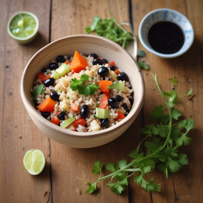 Este plato combina arroz integral nutritivo con caraotas negras y una variedad de verduras, creando una comida saludable y deliciosa. Perfecto para una cena reconfortante.