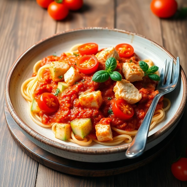 Pasta met Tomatensaus, Courgette en Kruidige Kip
