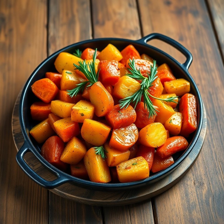 Een heerlijke combinatie van knapperige aardappelen en zoete wortelen, perfect geroosterd met verse kruiden.